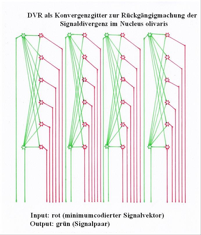 Dazu wurden die Signale dieses Signalsatzes in der sekundären Wendeschleife kopfwärts geschickt und an einen Neuronensatz übergeben, bei dem die Neuronen in einer vertikalen Linie übereinander angeordnet wurden. Hierbei blieb die Nachbarschaft der Signale so erhalten, wie sie im Nucleus olivaris bzw. im Kleinhirnkern gewesen ist. Genau über und unter diesen Inputneuronen war je ein Outputneuron angeordnet, jeweils eines oben und eines unten. Und alle Inputneuronen des Signalsatzes waren erregend mit beiden Outputneuronen verbunden. So wurden alle vertikal angeordneten Inputneuronen mit den zwei zugehörigen Outputneuronen des bivalenten Signalpaares verbunden. Dadurch wurde die cerebellare Signaldivergenz rückgängig gemacht.