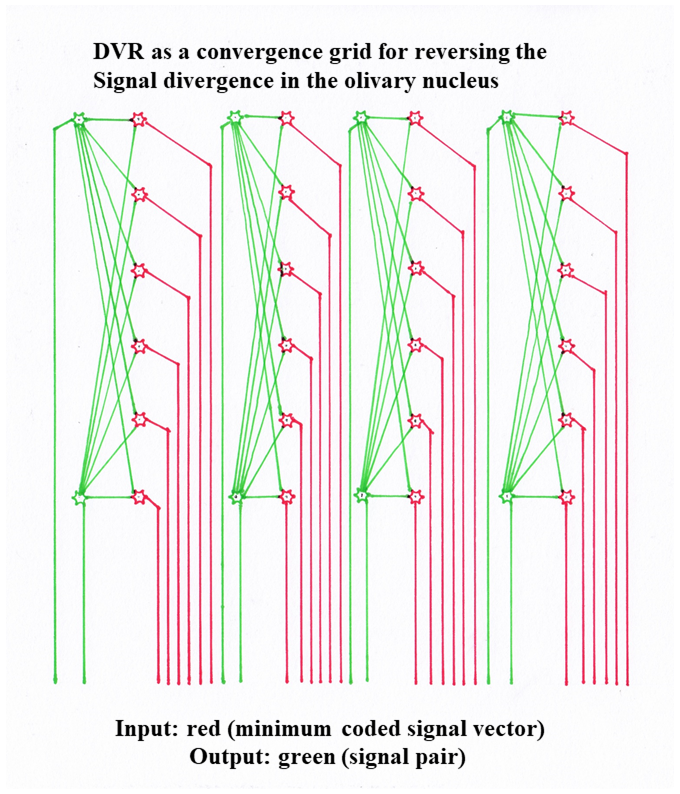 The dorsal ventricular crest (DVR) of reptiles and birds is a vertical convergence grid, which corresponds to the frontal cortex of mammals in its function, but is not oriented horizontally in the plane, but vertically in space. It reverses the signal divergence of the nucleus olivaris so that the output can be used for motor control.